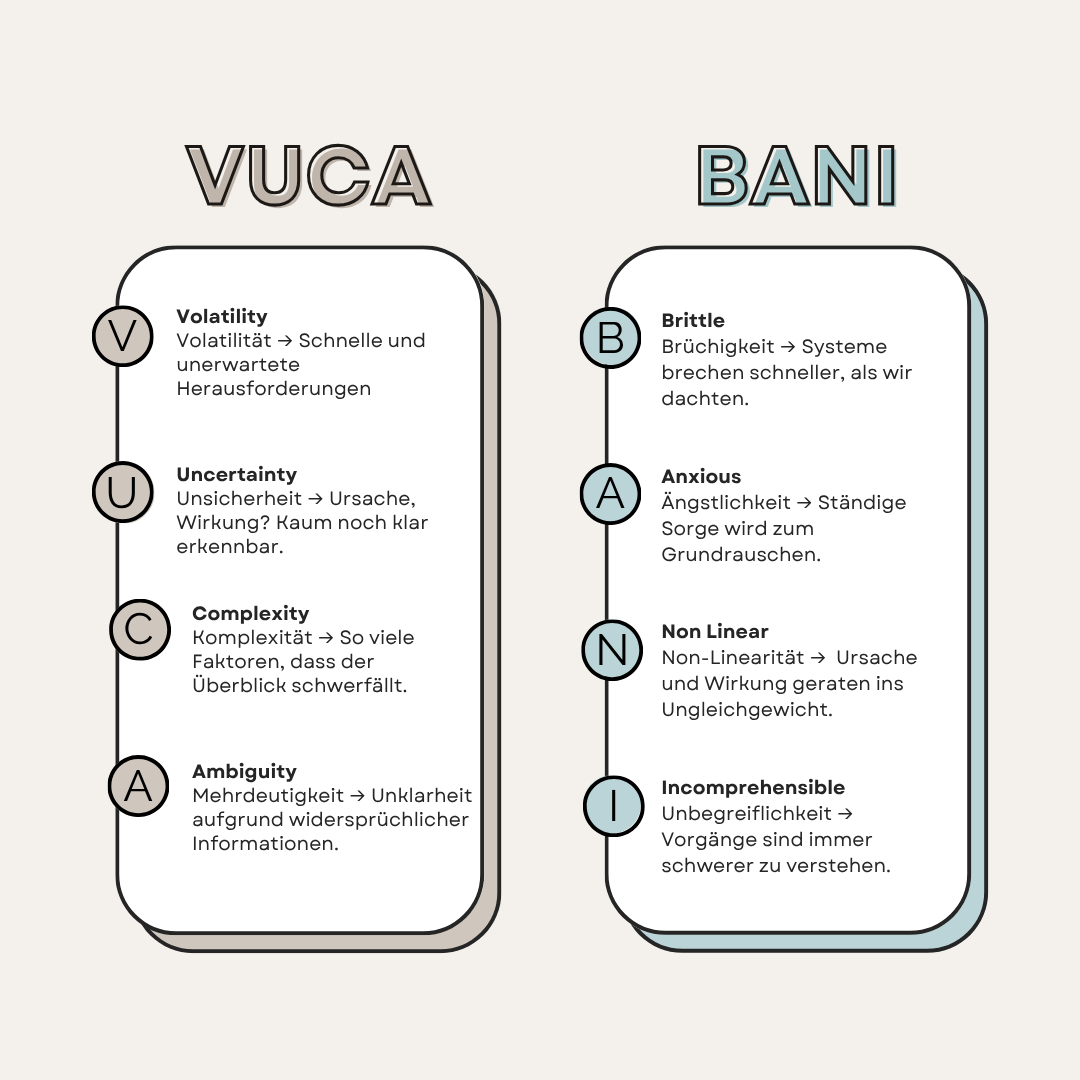 Während VUCA primär die Strukturveränderungen im Außen beschreibt, fokussiert das BANI-Modell auf die innere Reaktion des Menschen. Es wurde etwa ab 2020 von Jamais Cascio geprägt - als Antwort auf die zunehmende psychologische Erschütterung angesichts globaler Krisen. BANI steht für: